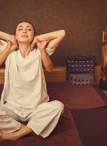 In Traditional Thai Massage, the practitioner uses their hands, elbows, knees, and feet to apply pressure along the body’s energy lines. This technique is often described as “lazy person’s yoga” because the therapist moves the client’s body into various stretches and postures.